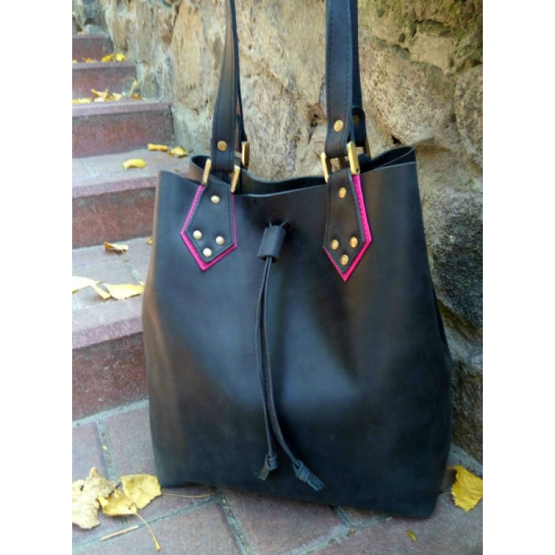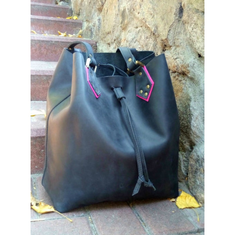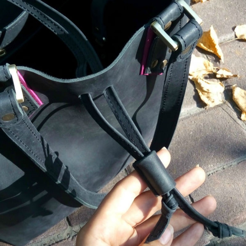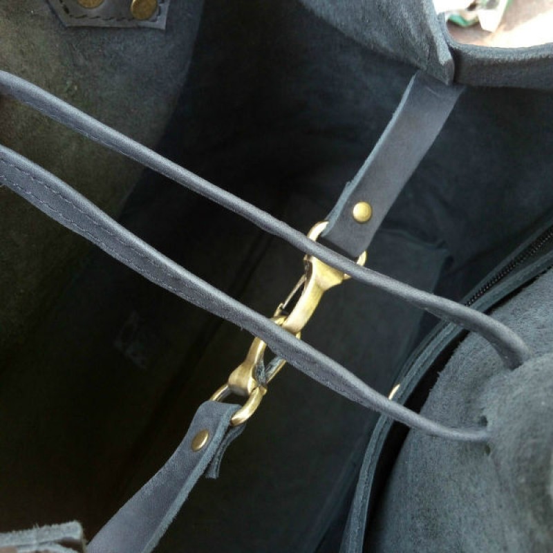 - Сумка затягивается кожаным шнурком и дополнительно фиксируется карабином.