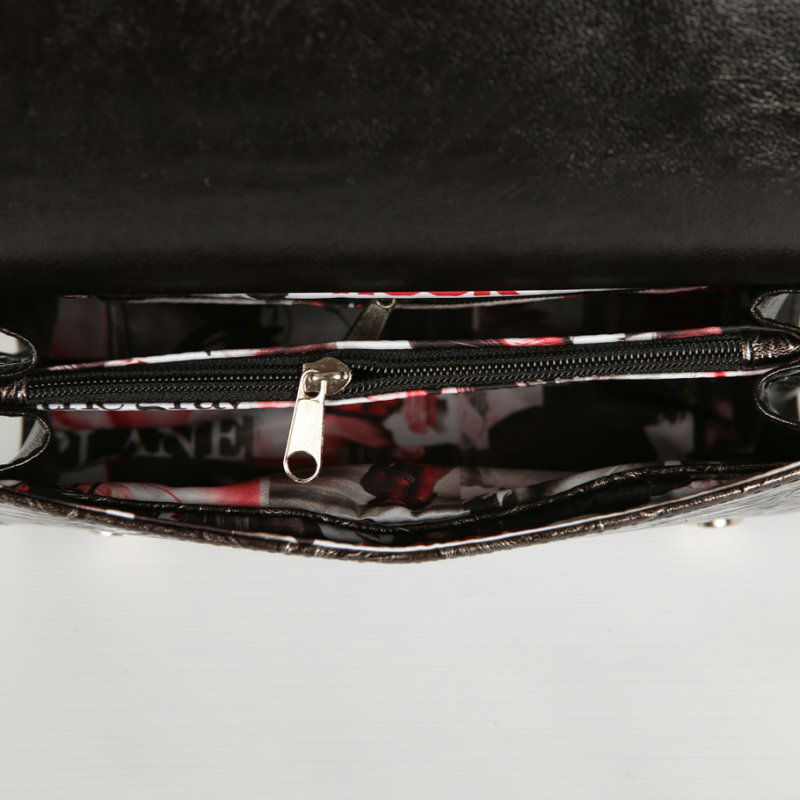 - Внутри клатча: два основных отделения разделенных карманом перегородкой на молнии, один открытый карман, один карман на молнии.