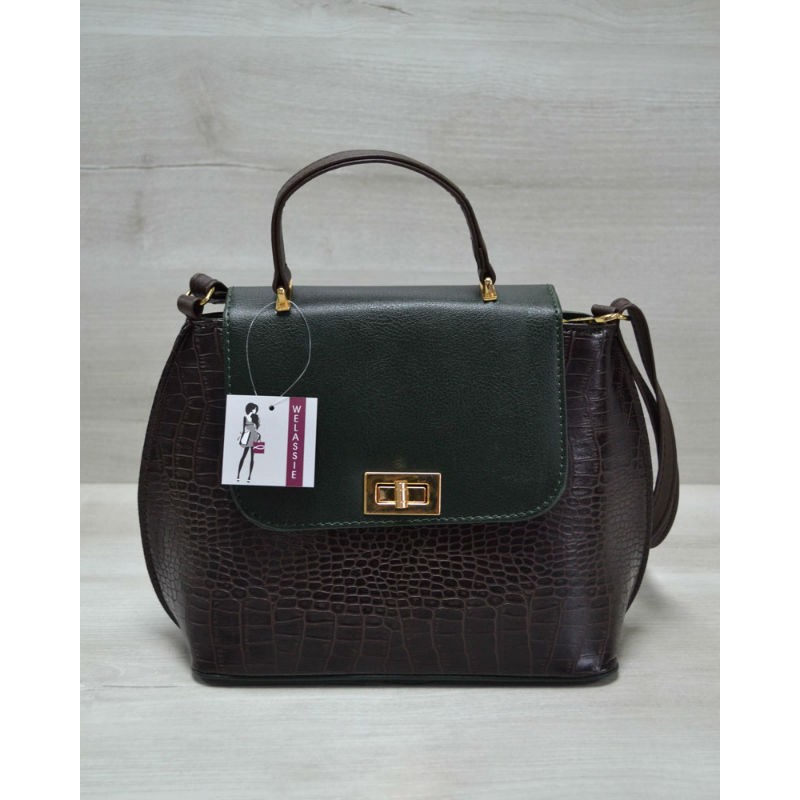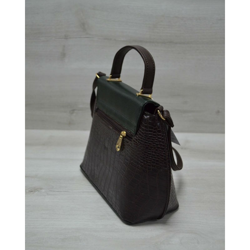 - Вместительная молодежная женская сумка-клатч Welassie коричневый крокодил с зеленым гладким 61411.