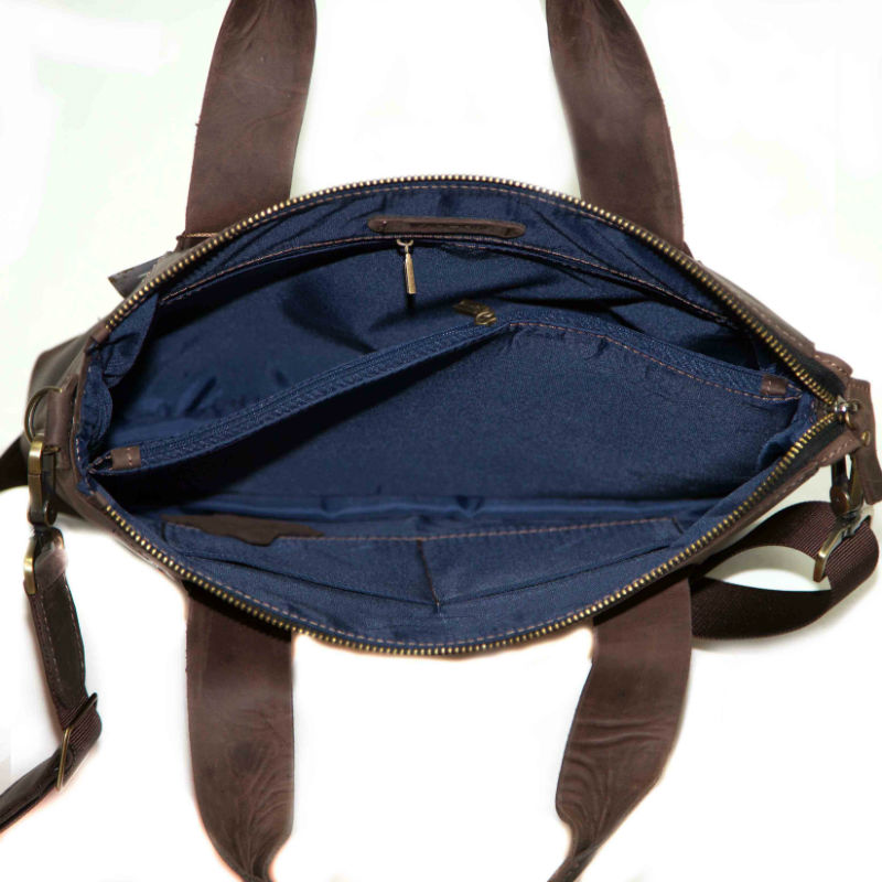 - Внутри портфеля расположены упрочненная перегородка на молнии, боковой карман на змейке и два небольших кармана для телефона и мелочей.