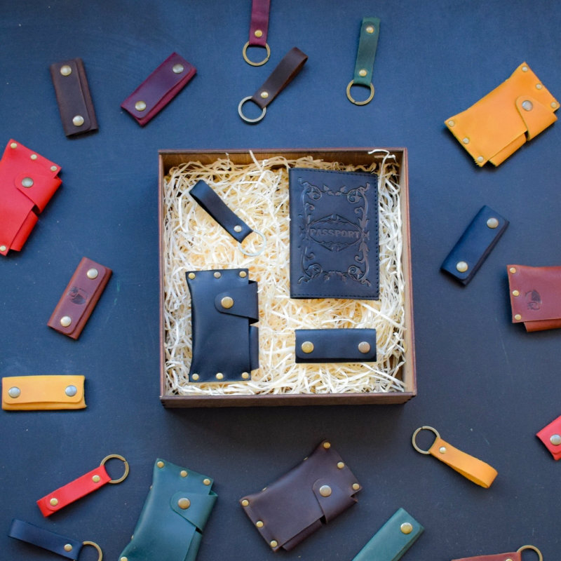 - Набор состоит из: кожаная обложка на паспорт, кожаный клобер для наушников, кожаный брелок, кожаная визитница.