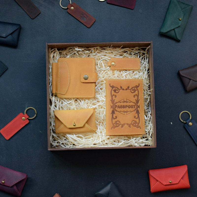 - В набор входят: кожаная обложка для паспорта, кожаный брелок, кожаная визитница-конверт, кожаное портмоне-зажим для денег.