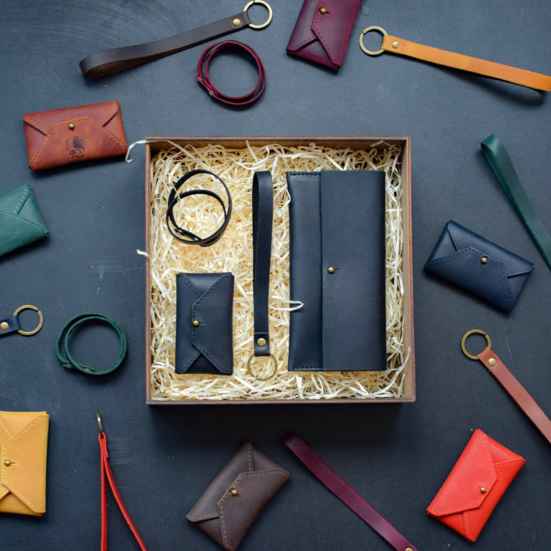 - В набор входят: кожаное портмоне, кожаный брелок, кожаный браслет, кожаная визитница-конверт.