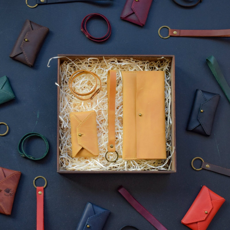 - В набор входят: кожаное портмоне, кожаный брелок, кожаный браслет, кожаная визитница-конверт.