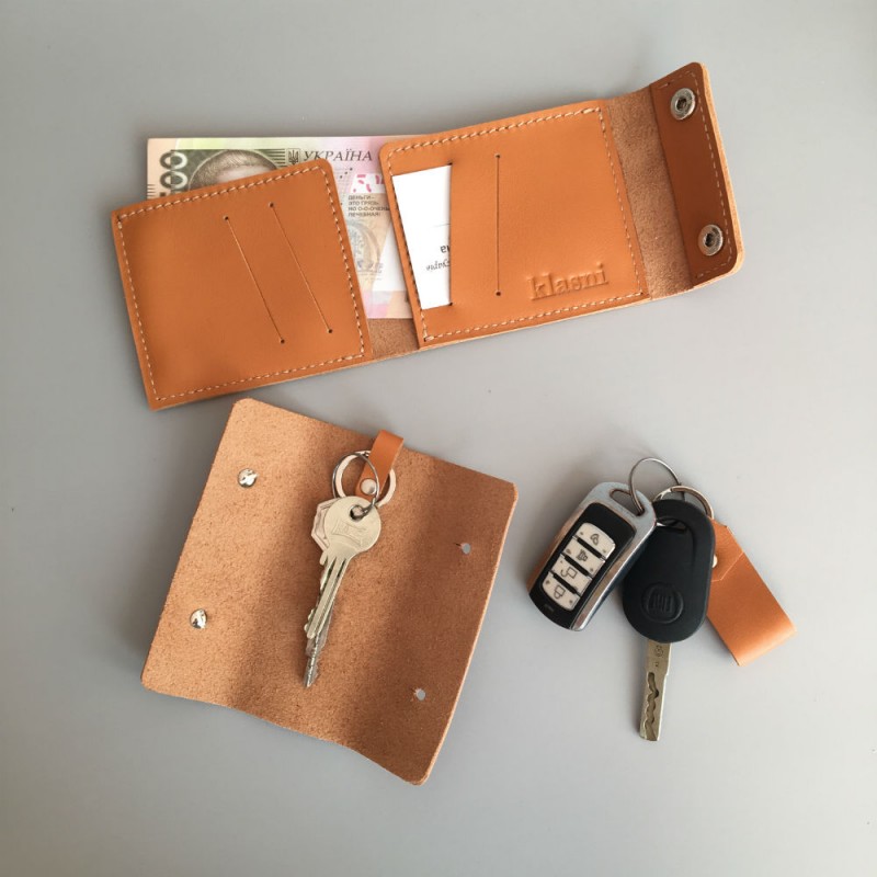 - В набор входить мини кошелек (размер 10,5*8,5 см), ключница (12*4,5 см) и брелок.