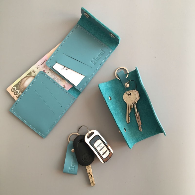 - В набор входить мини кошелек (размер 10,5*8,5 см), ключница (12*4,5 см) и брелок.