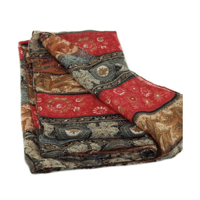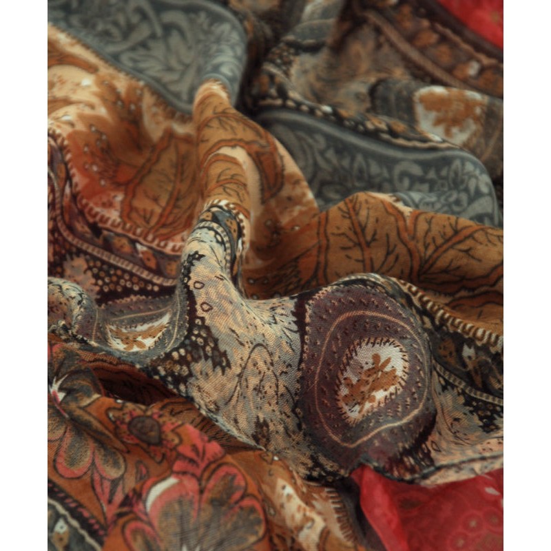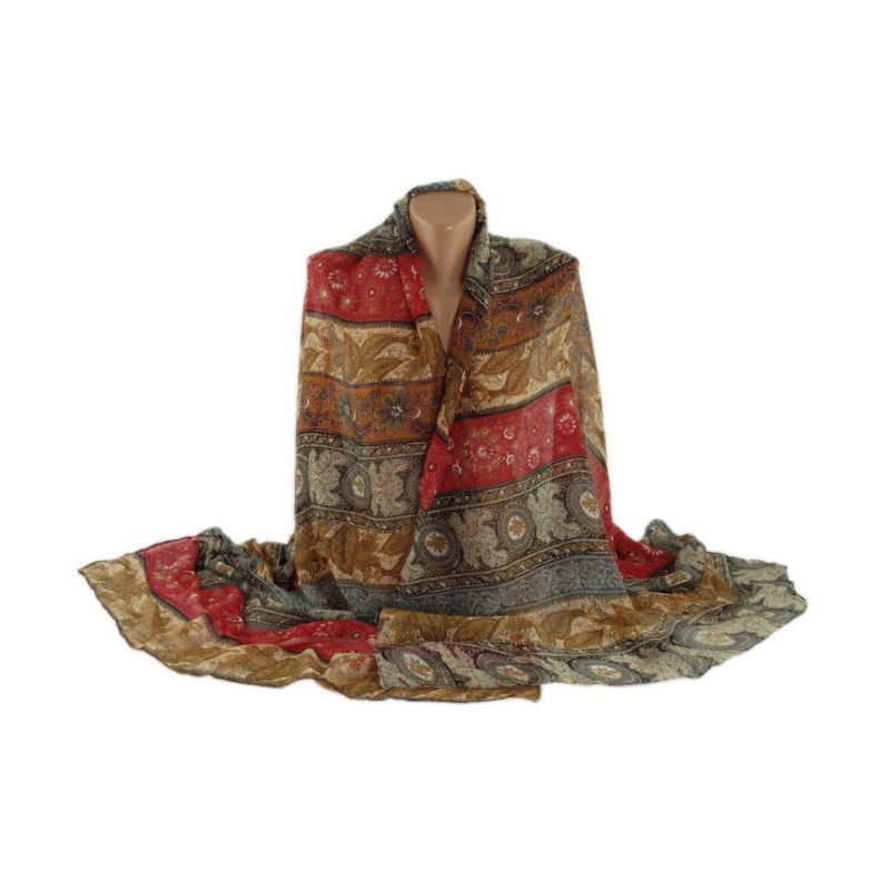 Шаль-парео TRAUM 2498-30 серая дополнена красным и коричневым. Украшена рисунком из кругов и листочков.