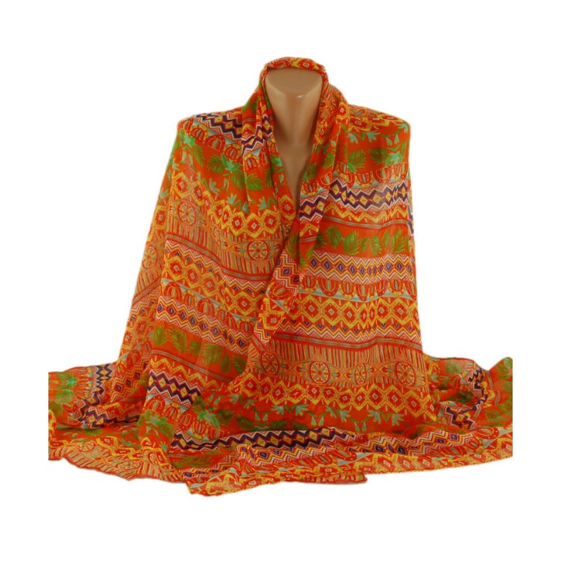 Шаль-парео TRAUM 2498-34 оранжевая с красивым принтом ромбиков и пальмовых листьев.