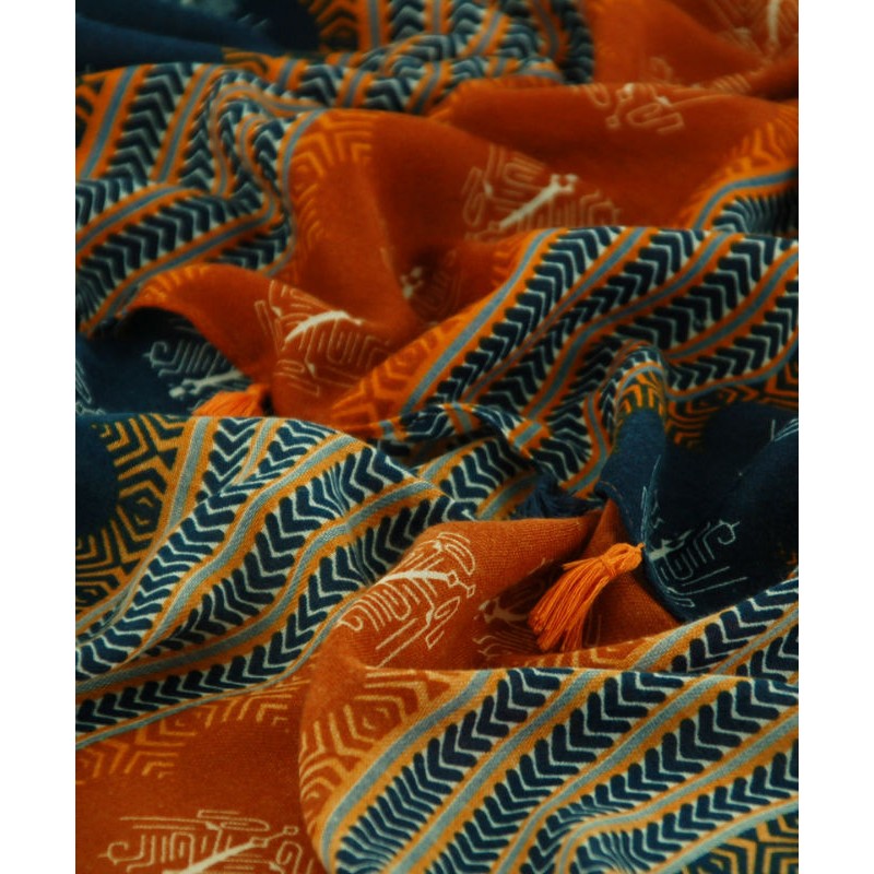 Шаль TRAUM 2493-36 синяя с коричневым принтом и украшена кисточками.