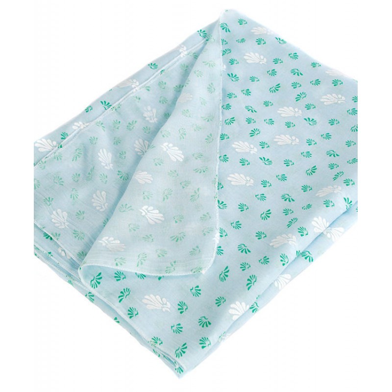 Шаль TRAUM 2494-43 голубая украшена нежным рисунком цветочков белого и зеленого цветов.