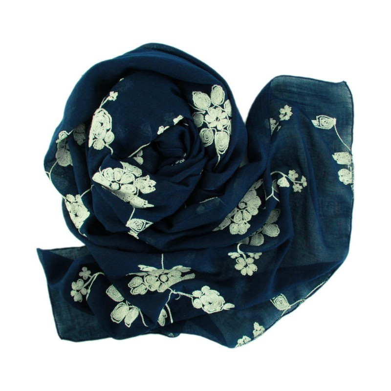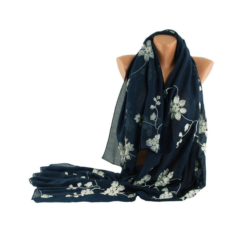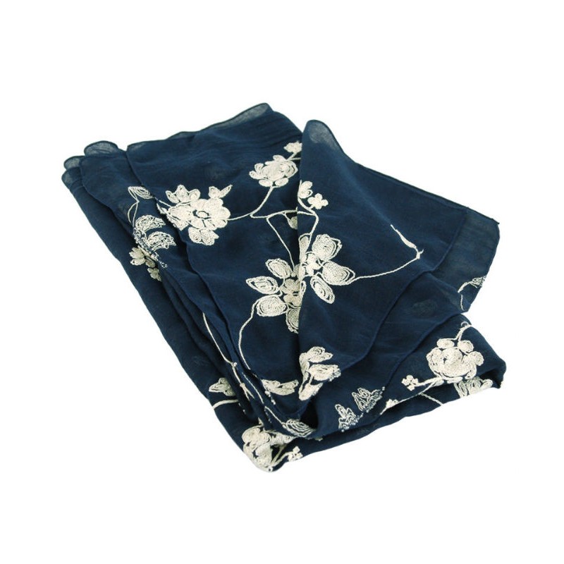 Шаль TRAUM 2494-64 синяя украшена вышивкой - белые цветы и листочки.