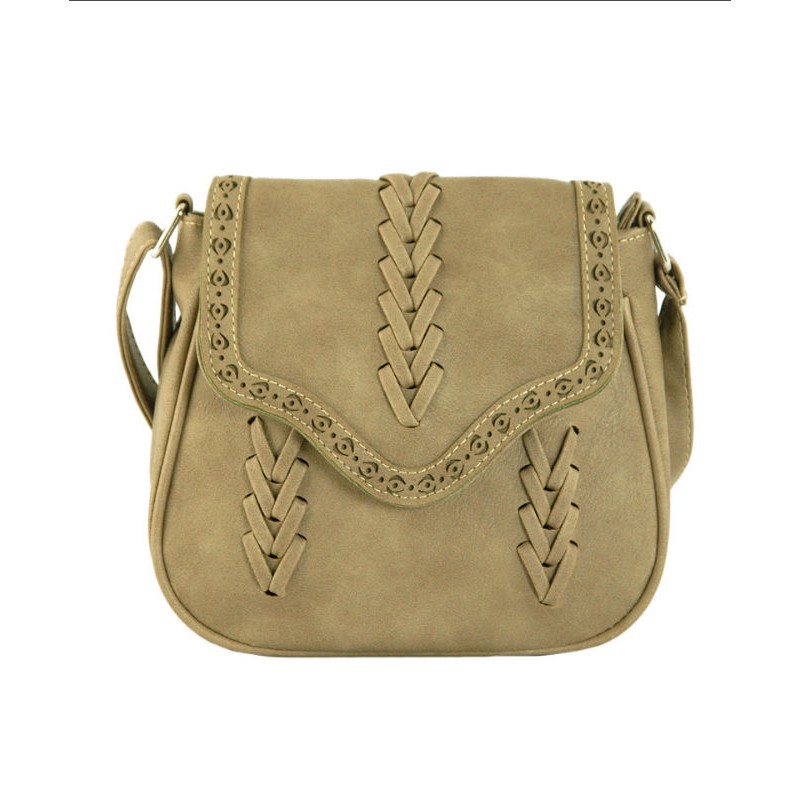 - Сумка-почтальонка 7215-37 бежевого цвета с перфорацией и плетеной косичкой.