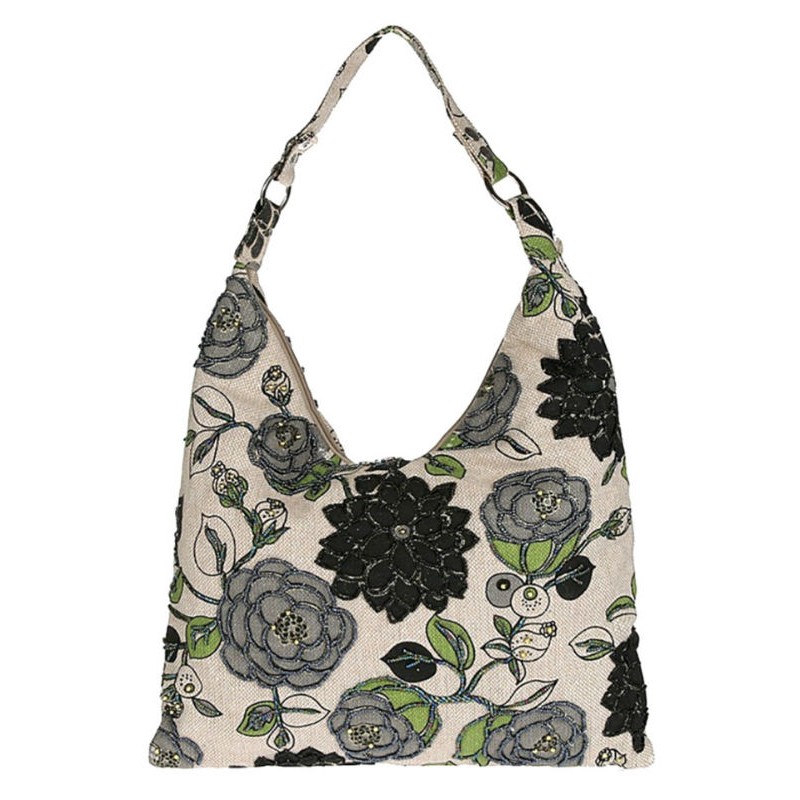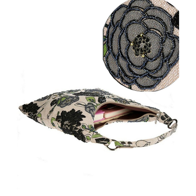 - Холщовая сумка с черным цветочным принтом расшита бисером.