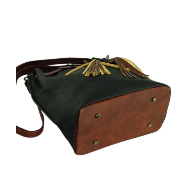 - Сумка 7236-10 черная затягивается «мешочком» на кожаный шнурок с бахромой.