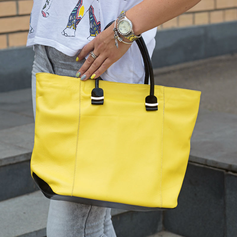 - Сумка женская кожаная 90163 желтая с вставками кожи черного цвета.