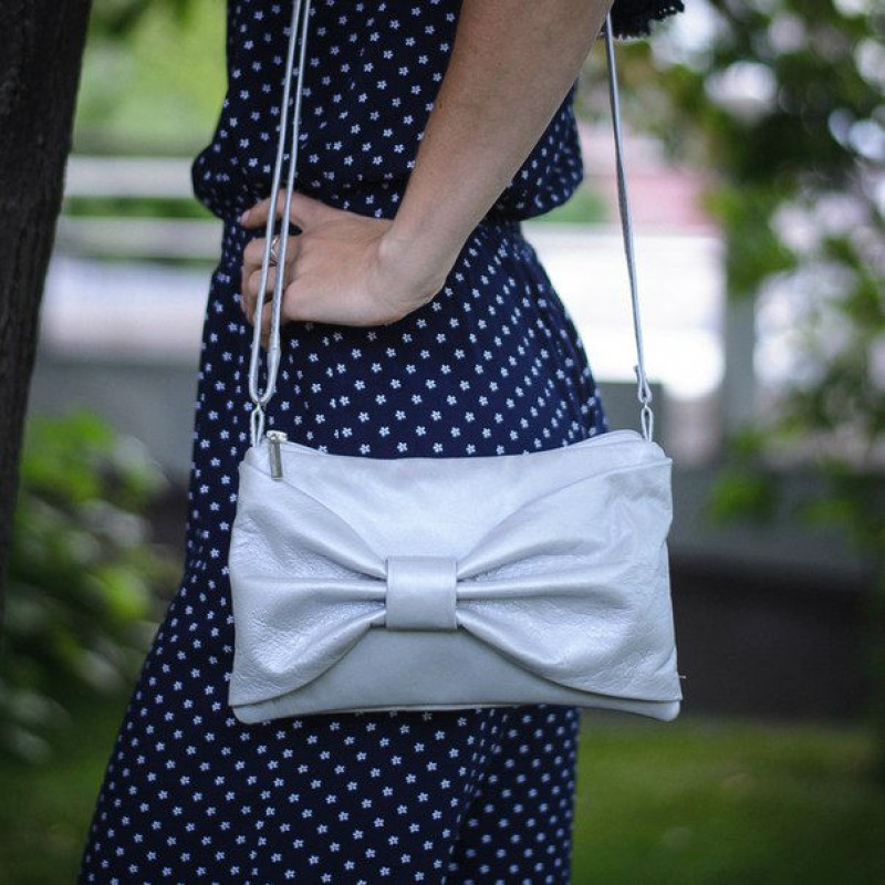 - Сумка женская кожаная 91247 серая украшена бантом на лицевой стороне.