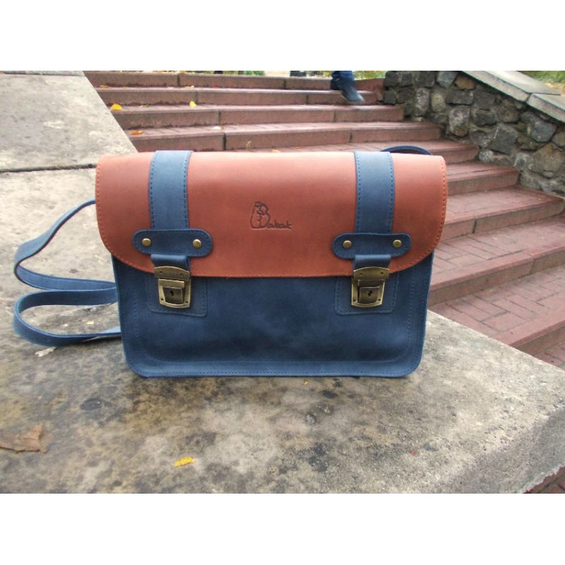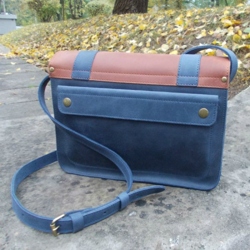 - Сумка-портфель 866062/65+ синяя с коричневым клапаном сделана из натуральной кожи «сrazy horse» с эффектом состаривания.