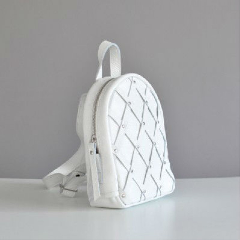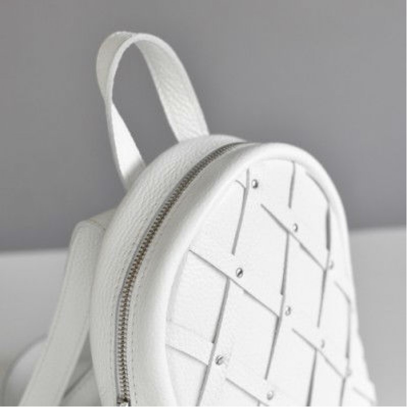 Виготовлена модель з натуральної високоякісної шкіри з красивою великою текстурою. Лицьовий дизайн виконаний з шкіряних стрічок і металевих заклепок, що надає виробу стиль і красу. З допомогою білого кольору рюкзак додасть жіночого образу легкість, а практична і зручна форма приємно здивують володарку.