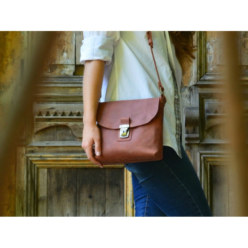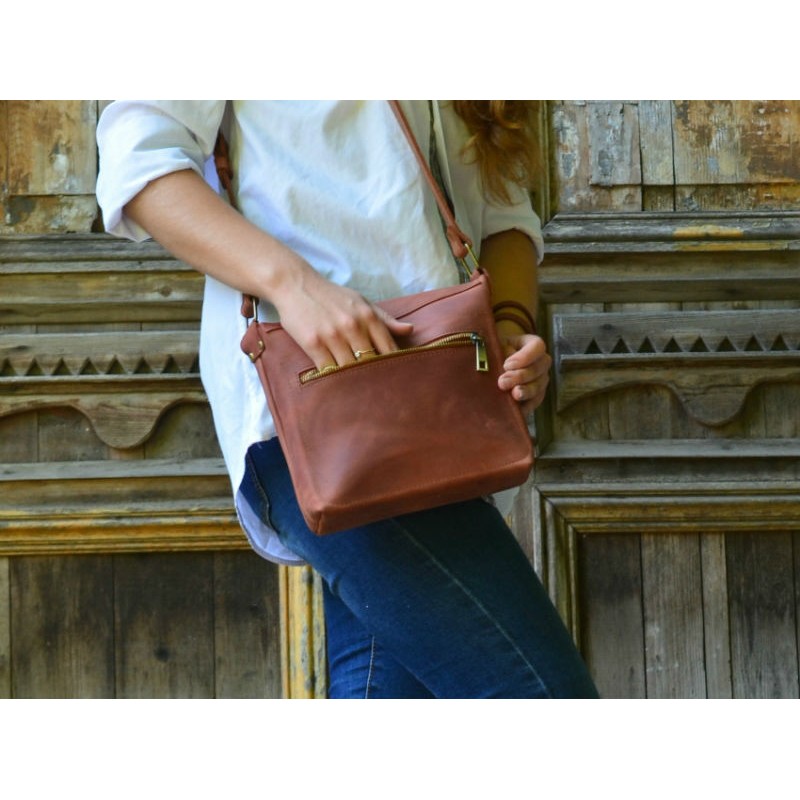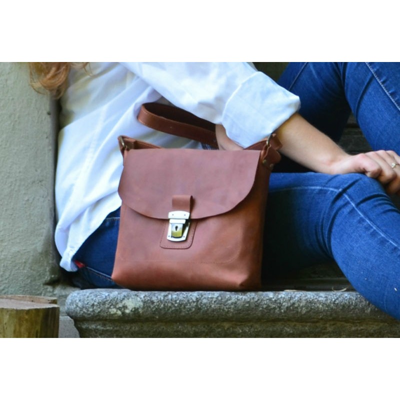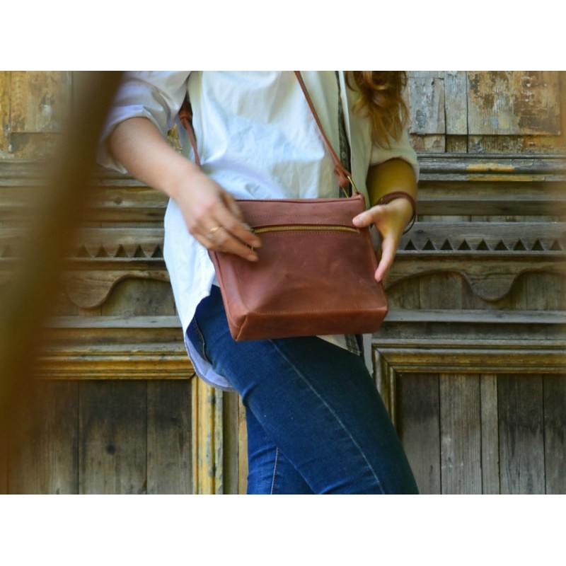 - Жіноча шкіряна сумка Сrossbody 886065 коньяк виконана з натуральної шкіри «сrazy horse» з ефектом старіння.