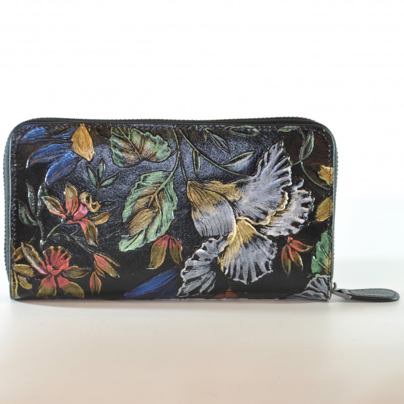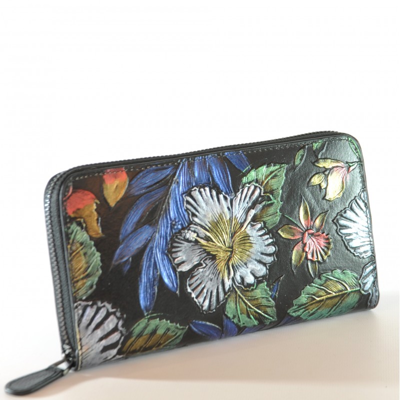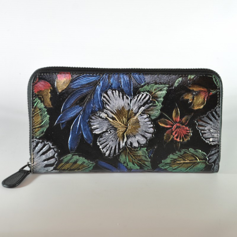 - Жіночий шкіряний гаманець Магнолія червона з тисненням і ручним розписом.