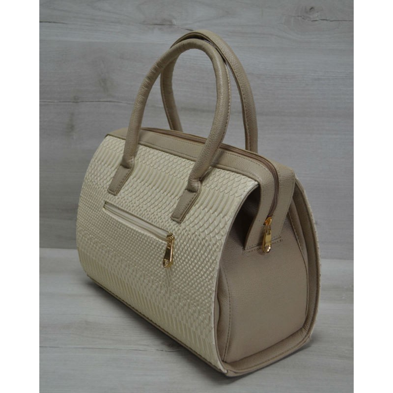 - Каркасна жіноча сумка Welassie Саквояж бежева рептилія з кавовими ручками 31118 зроблена з еко шкіри.