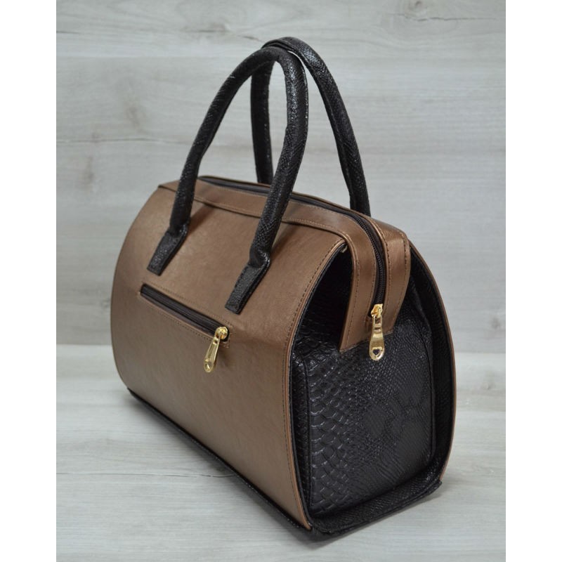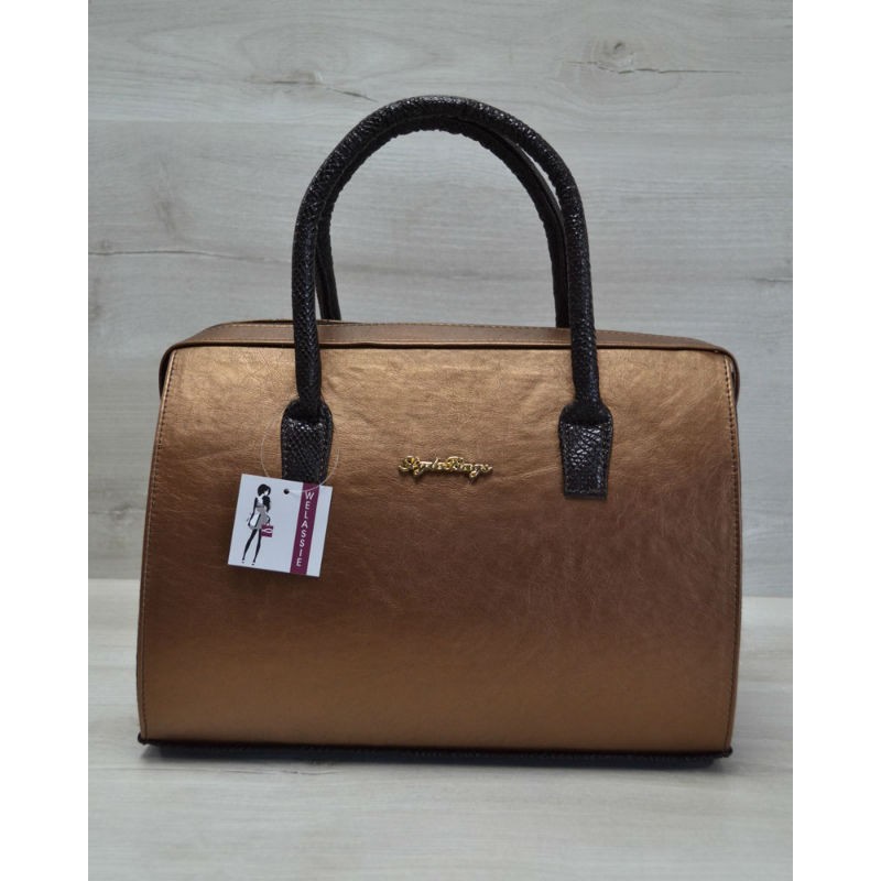 - Каркасна жіноча сумка Welassie Саквояж бронзовий гладкий з коричневими ручками 31114 зі шкіри PU.