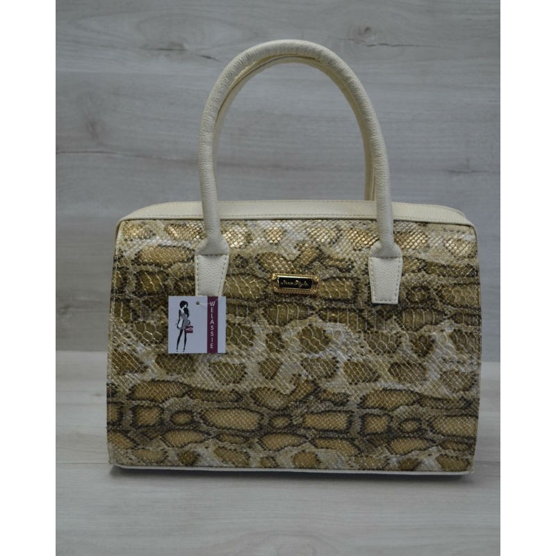 - Каркасна жіноча сумка Welassie Саквояж золота змія з бежевими ручками 31104 виконана з високоякісної шкіри PU.
