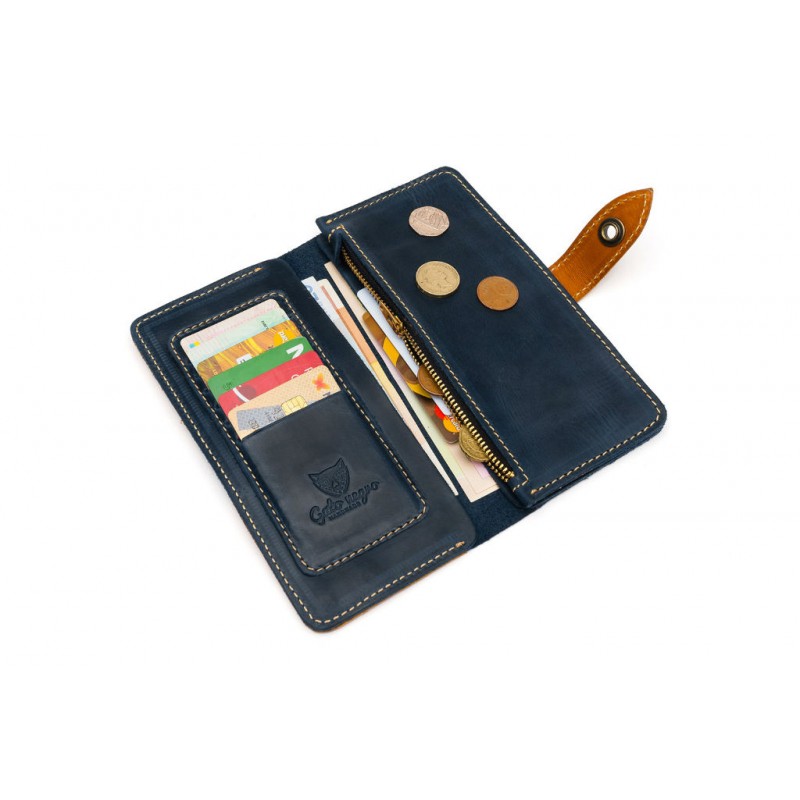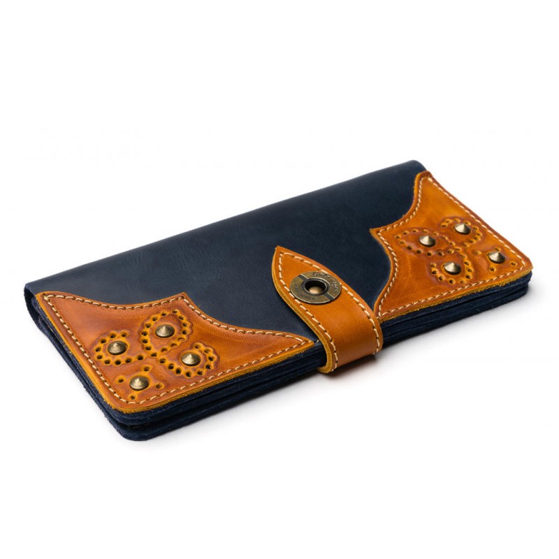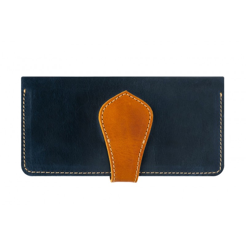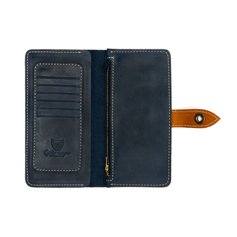 - Гаманець Gato Negro Retro Blue з натуральної шкіри синього кольору з шкіряними вставками рудого кольору.