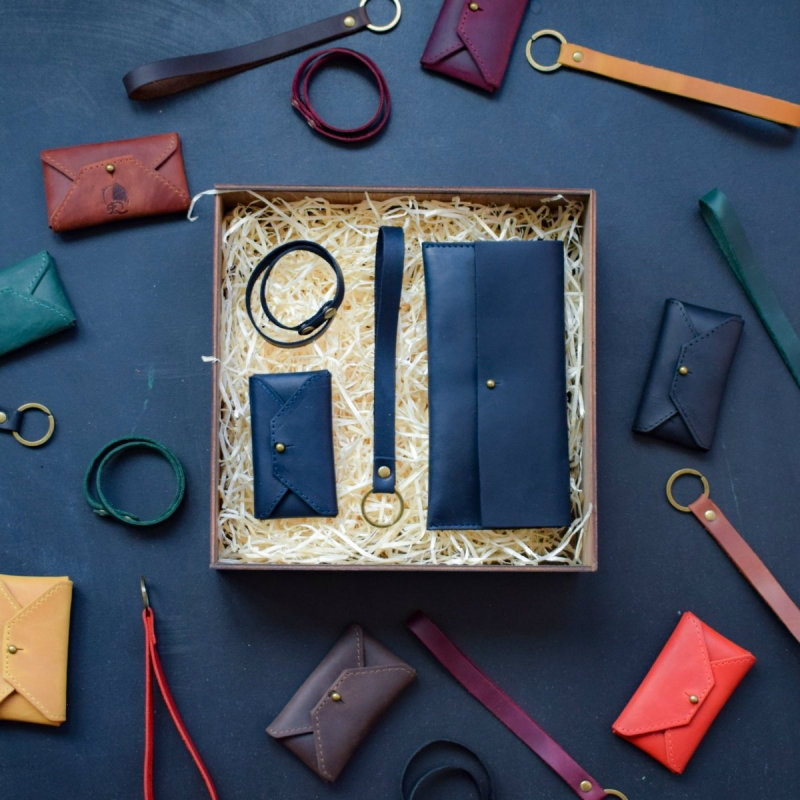 - В набір входять: шкіряне портмоне, шкіряний брелок, шкіряний браслет, шкіряна візитниця-конверт.