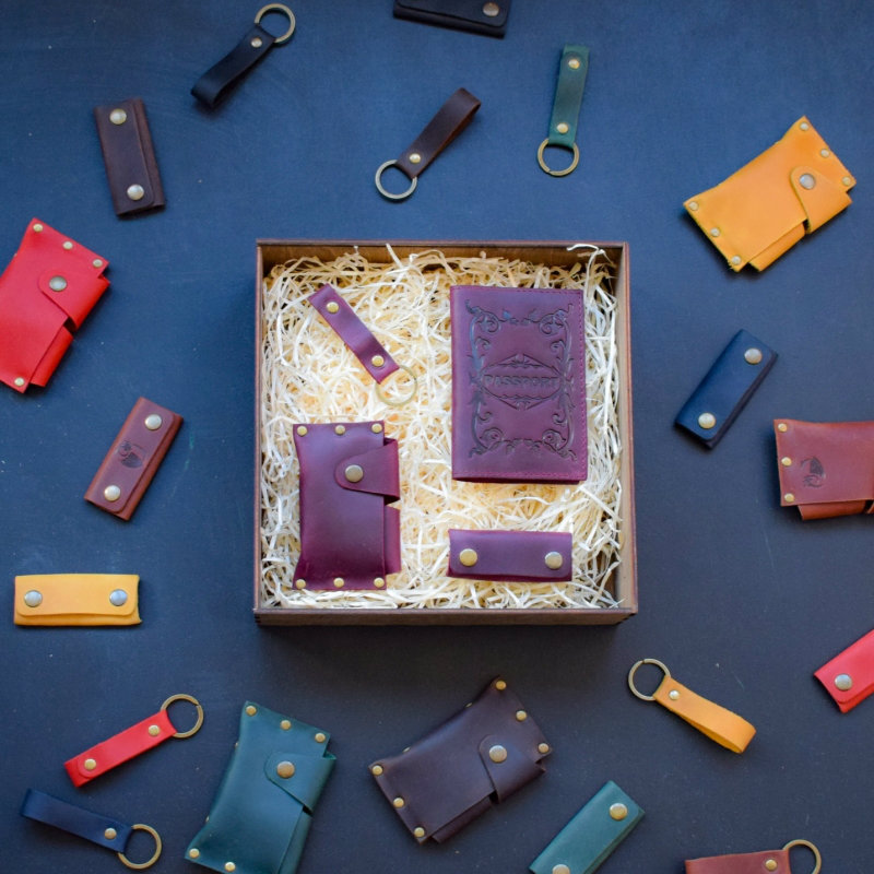 - Набір складається з: шкіряна обкладинка на паспорт, шкіряний клобер для навушників, шкіряний брелок, шкіряна візитниця.