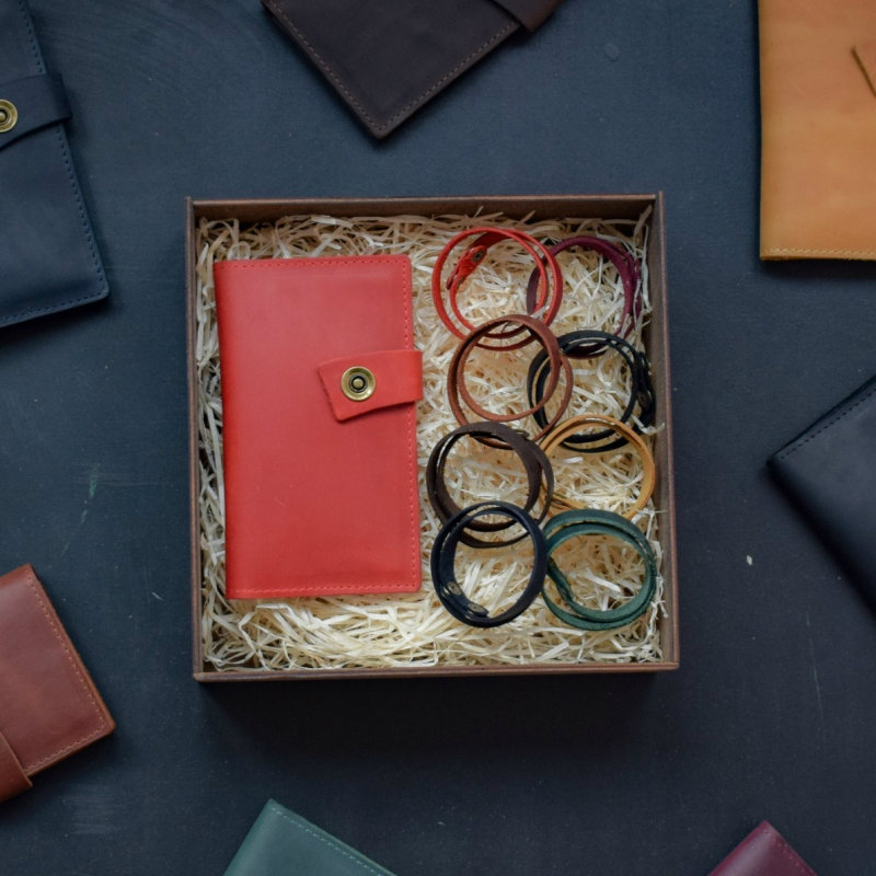 - В набір входять: шкіряне портмоне, 8 шкіряних браслета різних кольорів.
