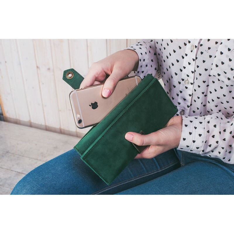 Зовні кишеня для телефону. Всередині один відділ закривається на клапан з кнопкою, є відкритий кишені для купюр і чотири для карток.