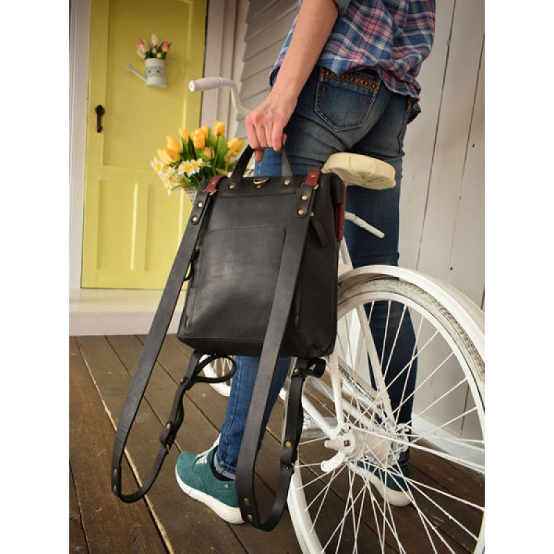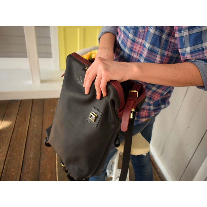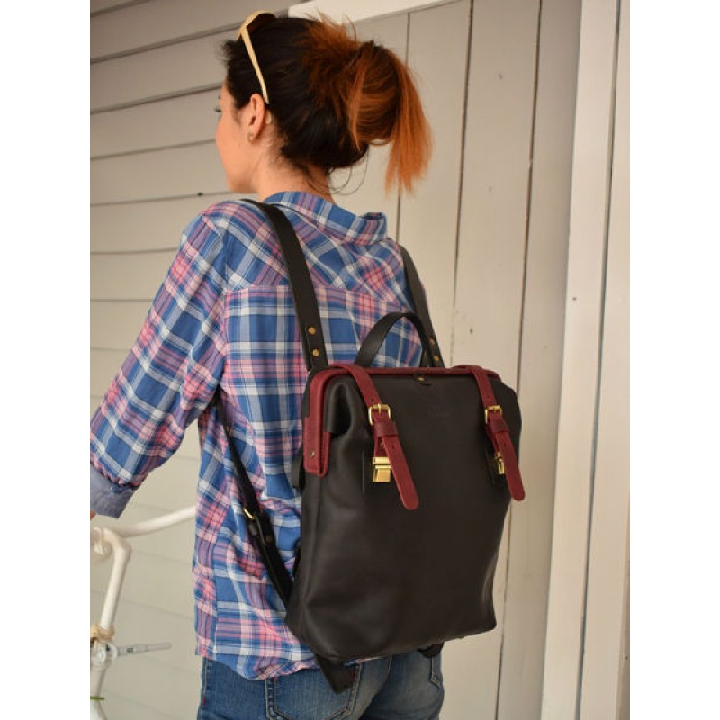 - Закривається за допомогою металевої рамки що забезпечує легкий доступ всередину і 2 шкіряних лямок на металевих засувках.