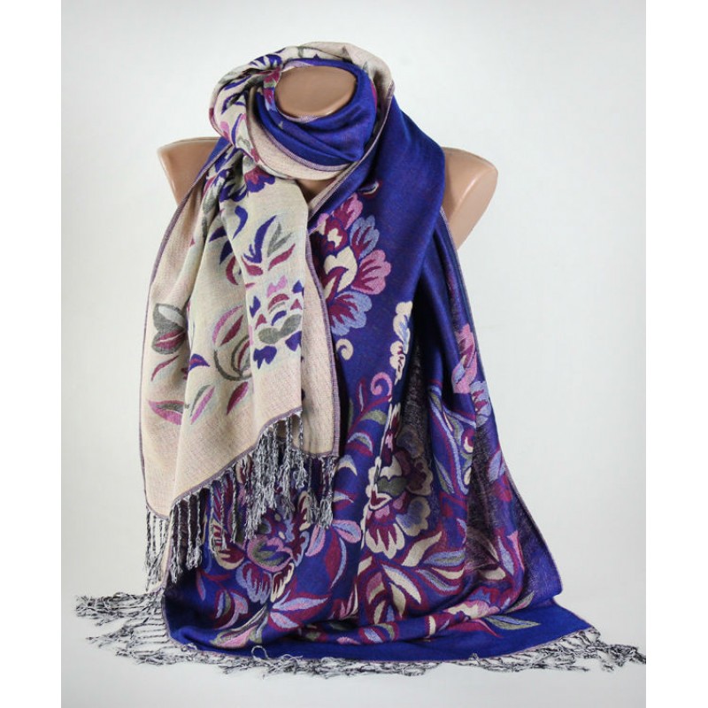 Шаль TRAUM 2493-50 синя з малиновими квітами в етнічному стилі.