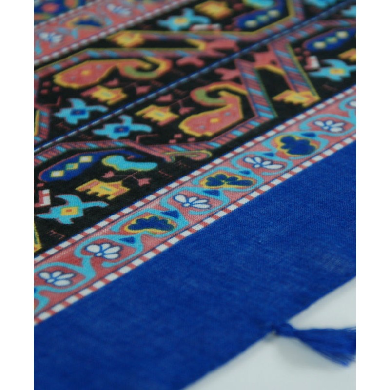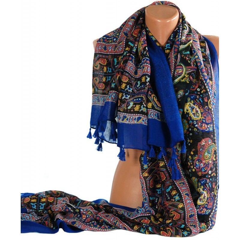 Шаль TRAUM 2494-31 синя прикрашена етнічним принтом і пензликами. Виконана з бавовни.