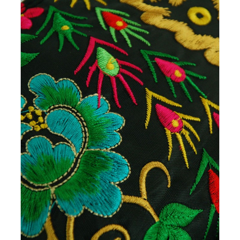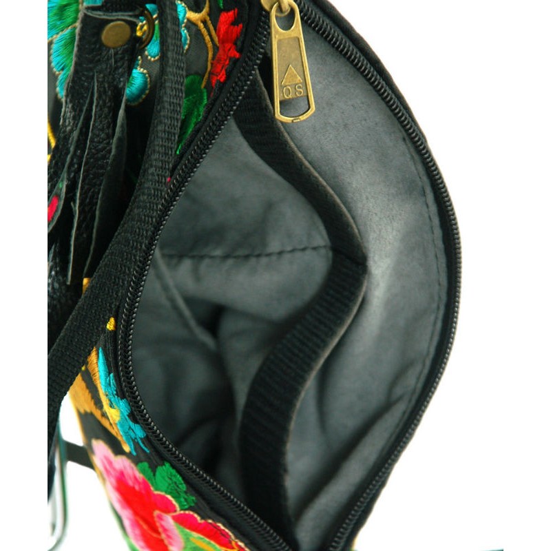 - Атласна структурна сумка-клатч 7216-10 чорна з вишивкою "квіти" і пензликами з боків.