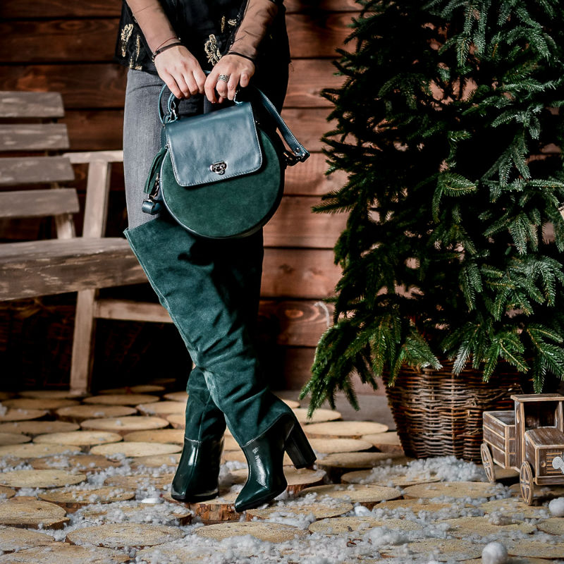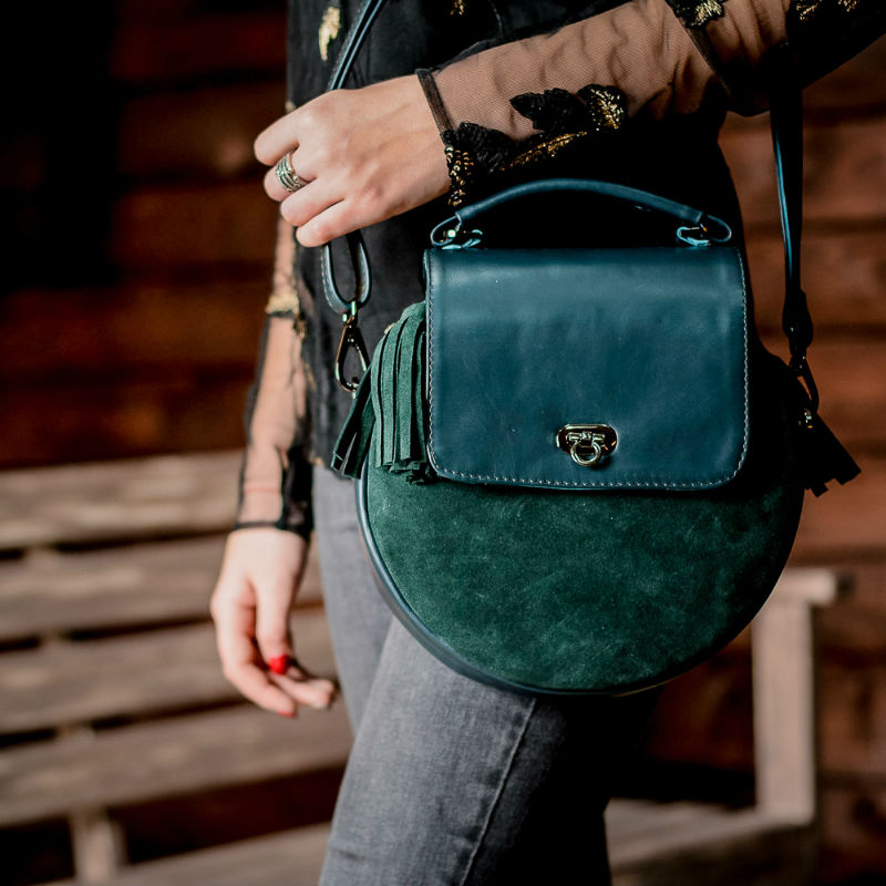 - Кругла сумка жіноча шкіряна 91913 зелена з замша і гладкої шкіри.