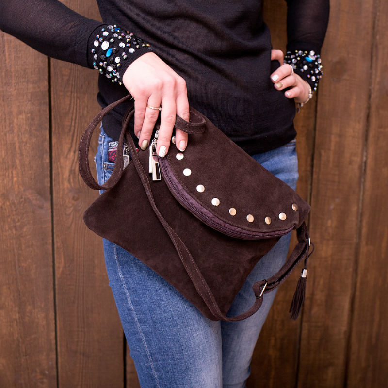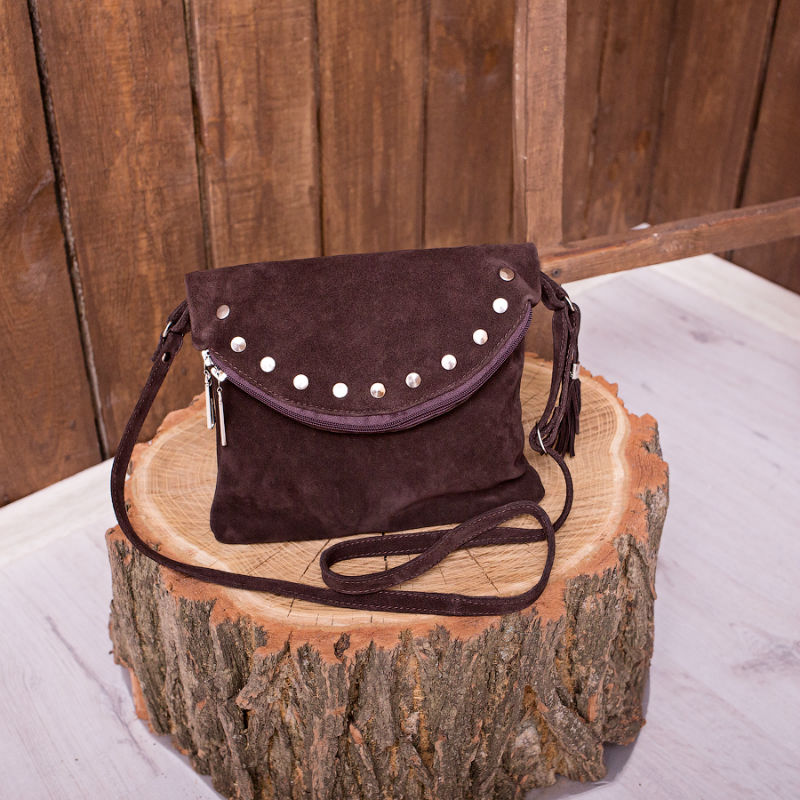 - Сумка жіноча замшева 91296 коричнева декорована кнопками.